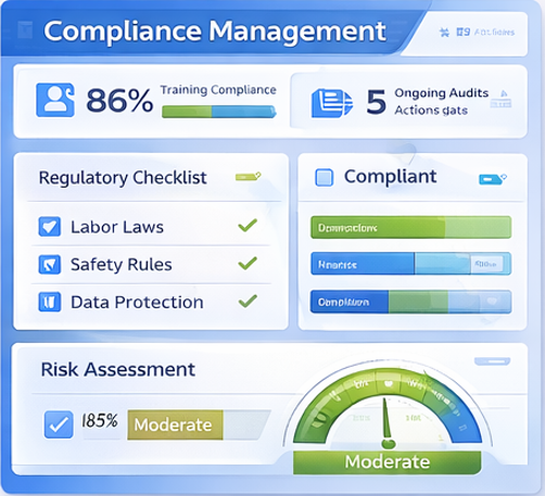 Ensures adherence to labor laws, statutory regulations, and employment policies, minimizing legal risks and maintaining governance standards.