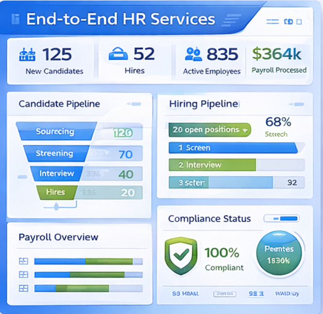 From contract staffing and payroll outsourcing to AI-powered candidate matching, workforce analytics, compliance management, and end-to-end HR services - we provide comprehensive solutions to streamline your entire workforce operations.